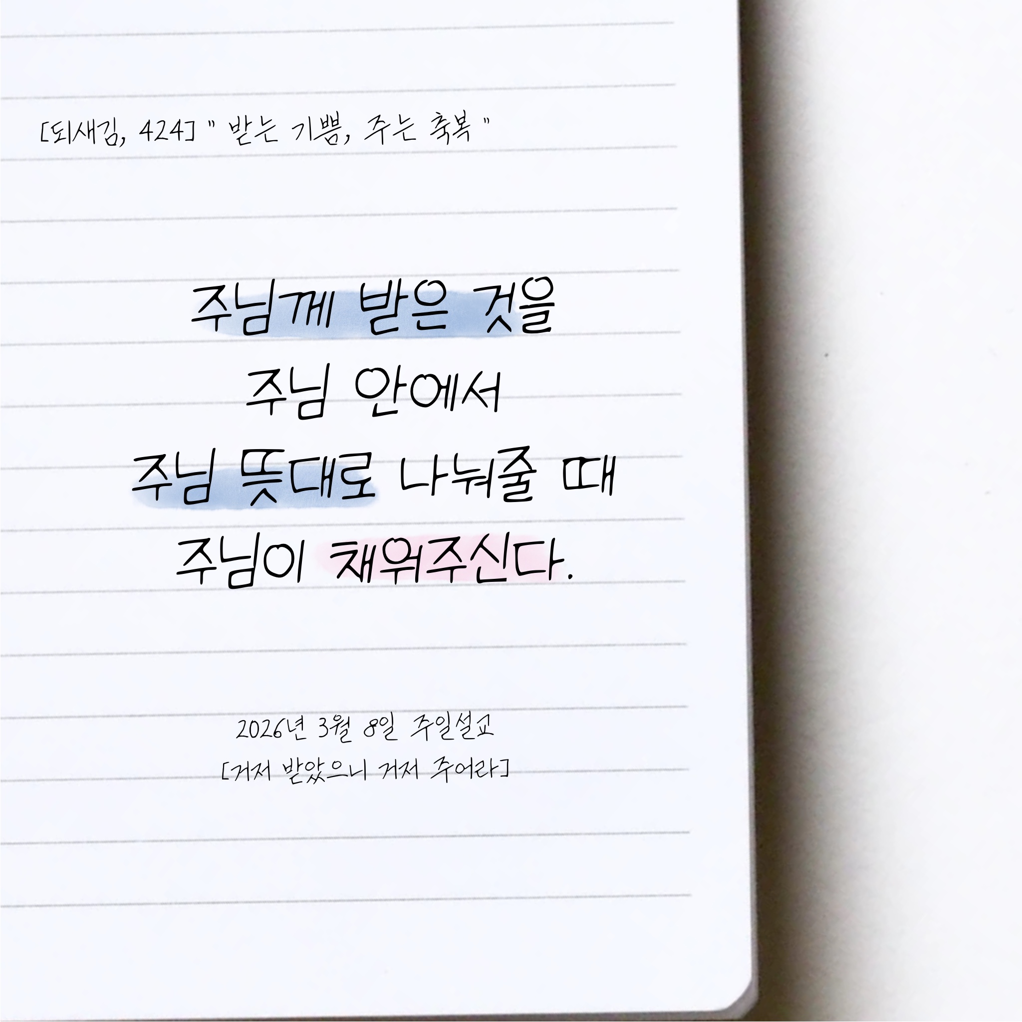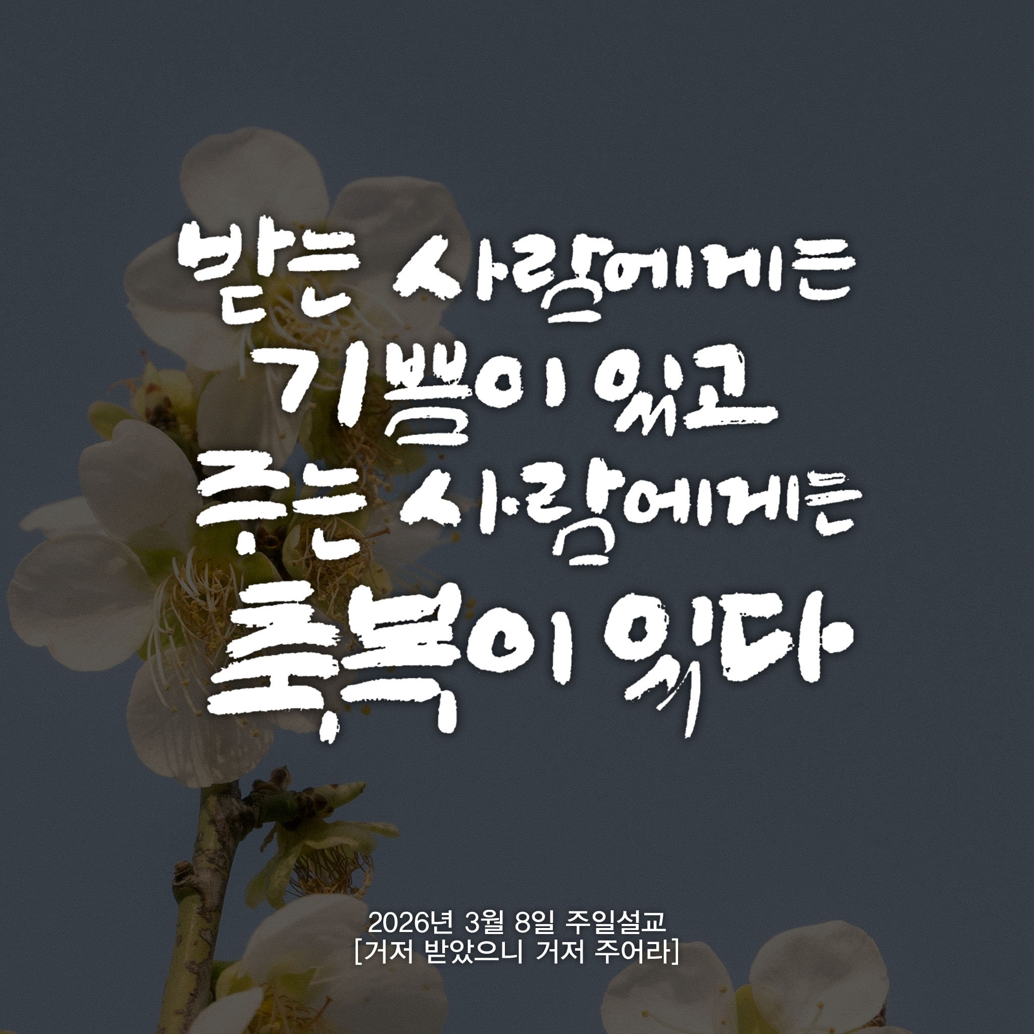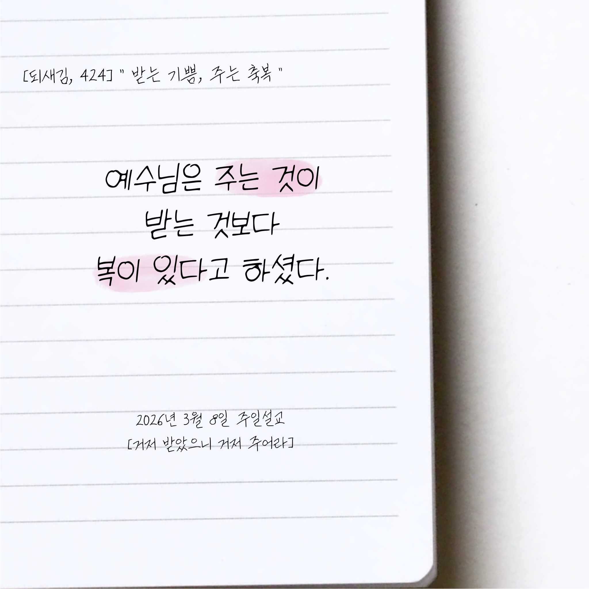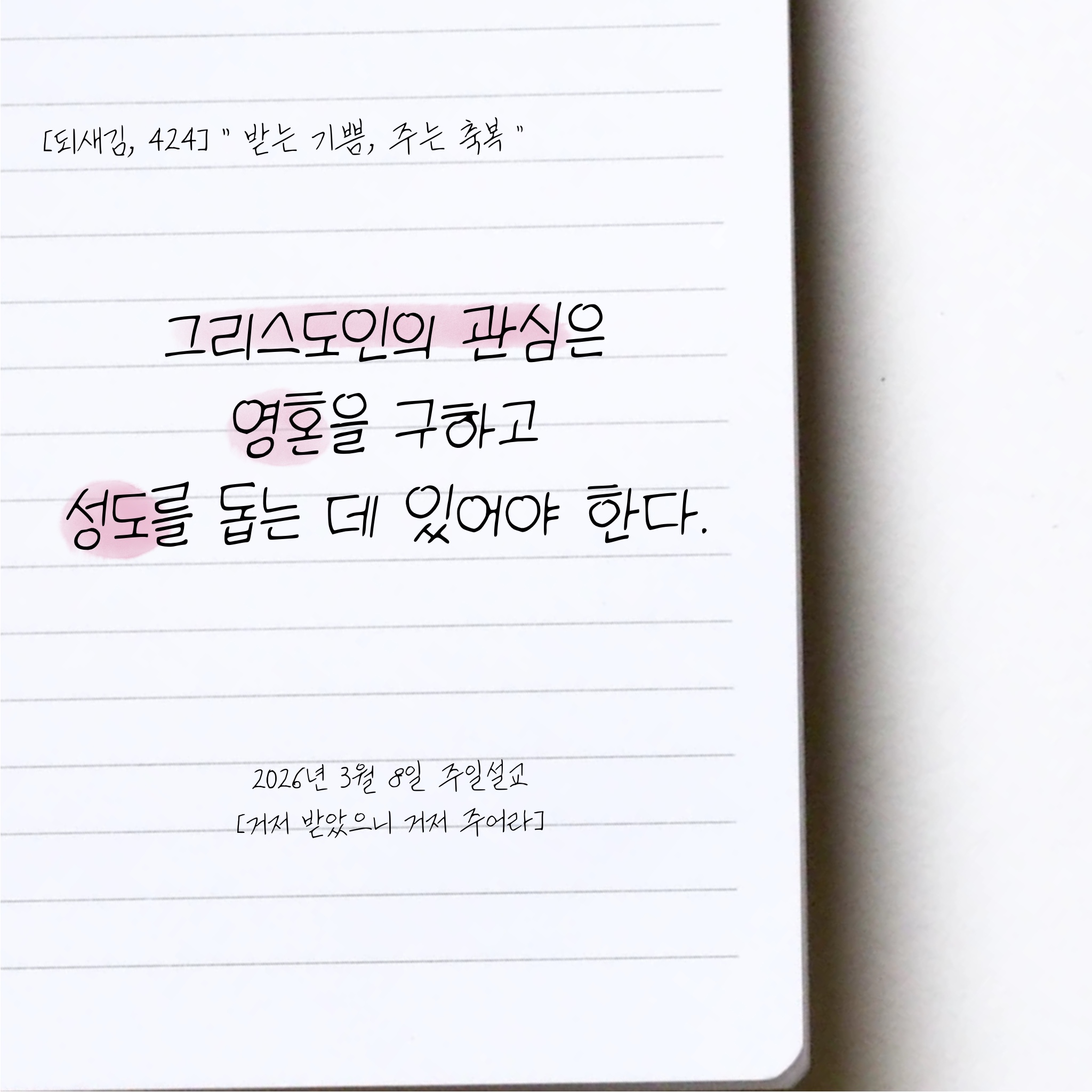 그래서 (행 20:35) ‘주 예수의 친히 말씀하신바 주는 것이 받는 것보다 복이 있다 하심을 기억하여야 할지니라’ 주님이 말씀하셨죠. ‘주는 것이 받는 것보다 복이 있다’ 그런데 우리는 주는 걸 참 인색하게 생각해요, 그렇죠? 받는 건 좋아하죠? 그런데 받는 자에게는 기쁨이 있지만 주는 자에게는 복이 있습니다. 복이 있다는 것은, 내가 주면 주님이 주세요. 많이 주면 또 주세요. 참 이것을 알면 재미있는데. 하나님의 사람의 관심은요, 우리 구원받은 사람은 하나님의 사람 맞잖아요. 그리스도인. 그리스도인이라는 말은 그리스도가 그 안에 살고 있는 사람.