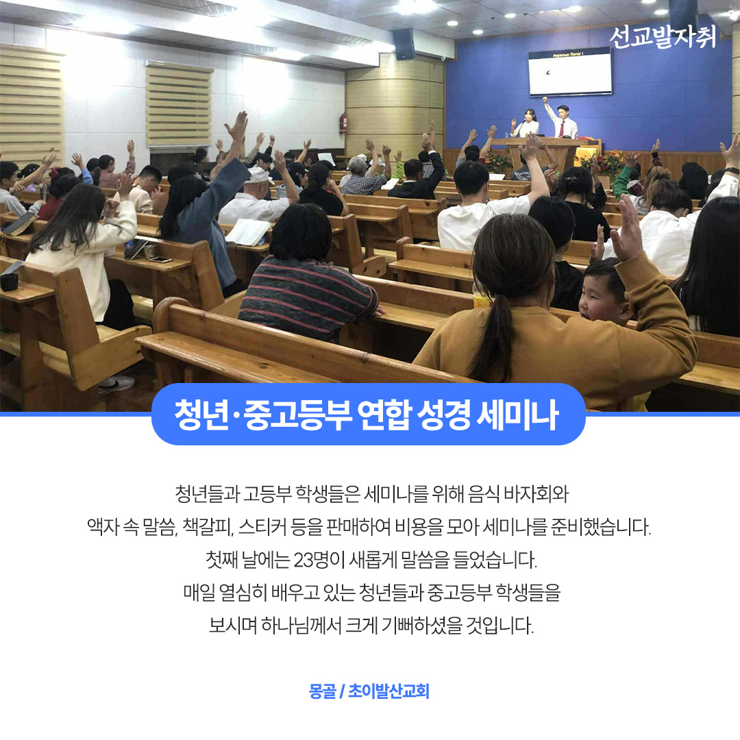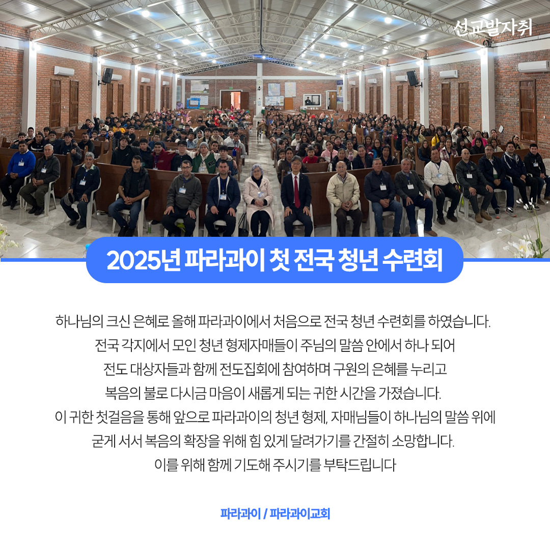 이 귀한 첫걸음을 통해 앞으로 파라과이의 청년 형제, 자매님들이 하나님의 말씀 위에 굳게 서서 복음의 확장을 위해 힘 있게 달려가기를 간절히 소망합니다.