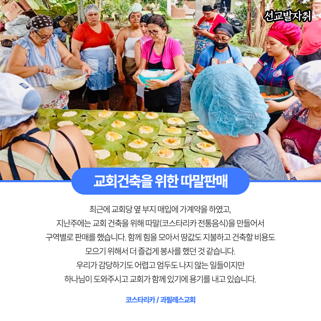최근에 교회당 옆 부지 매입에 가계약을 하였고, 지난주에는 교회 건축을 위해 따말(코스타리카 전통음식)을 만들어서 구역별로 판매를 했습니다.