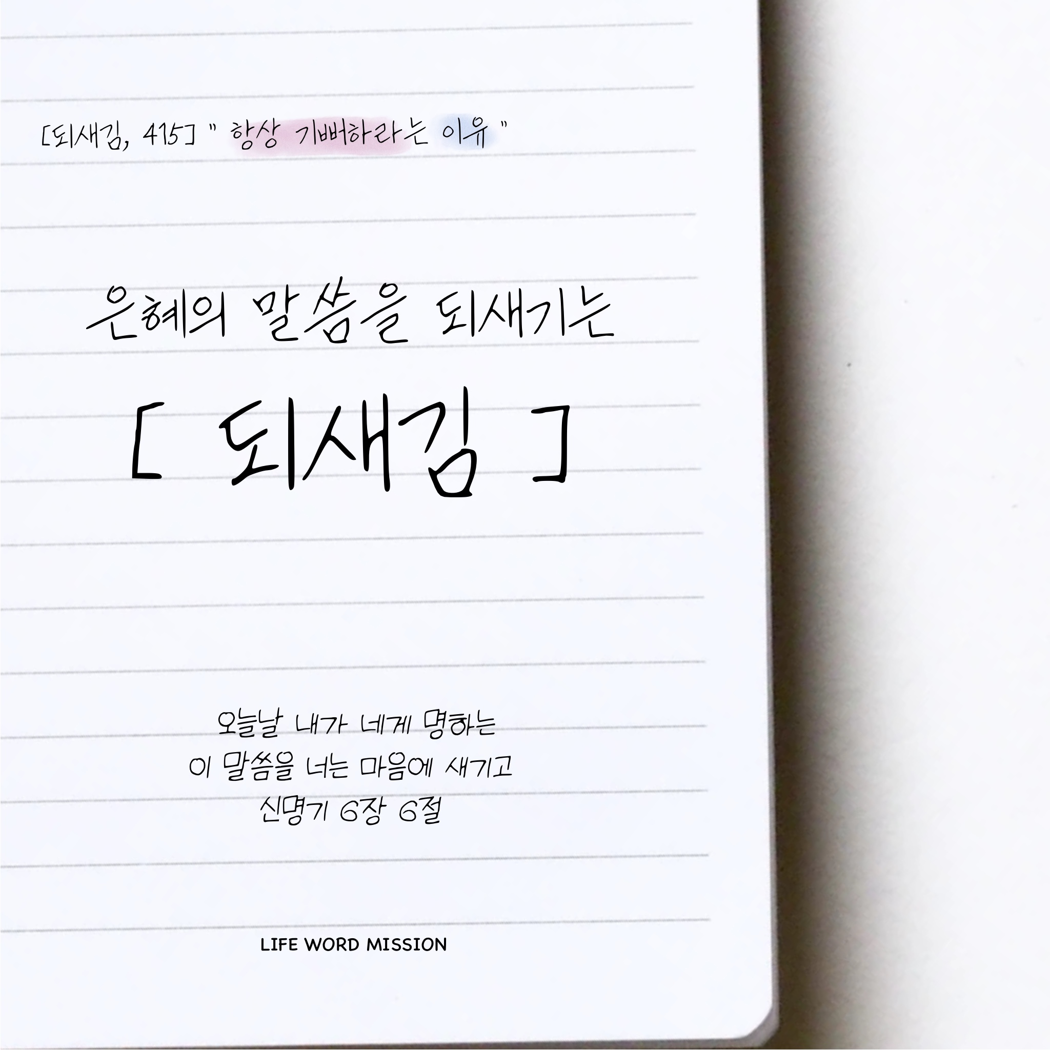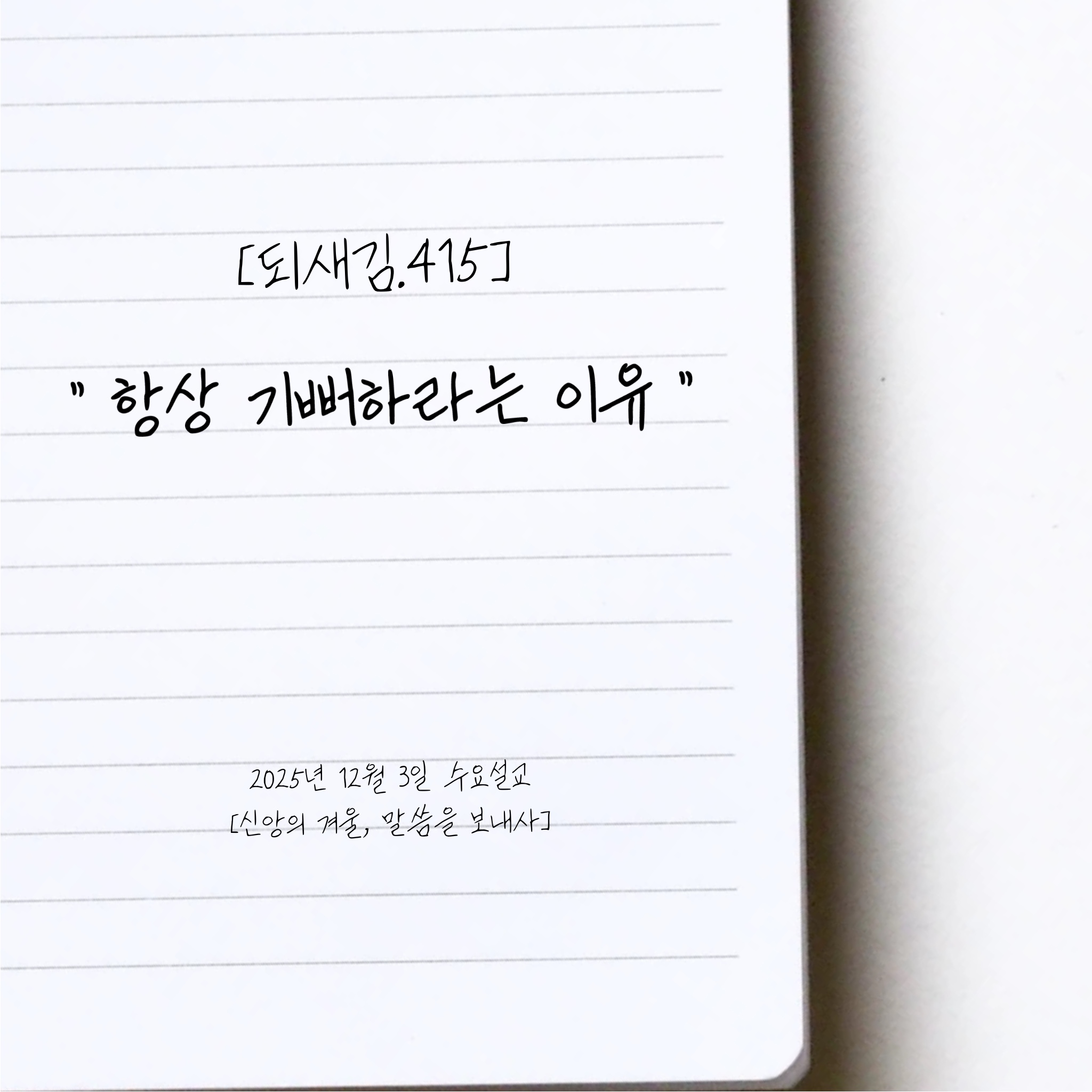 우리 데살로니가전서 5장 말씀은 잘 아시는 말씀이지만 한번 찾아보시죠. 데살로니가전서 5장. 구원받은 그리스도인의 근본이 이래야 된다는 걸 알려주고 계시죠. 데살로니가전서 5장 16~18절입니다. 우리 암송하시는 분도 많으실 거예요, 그렇죠. 그래서 암송하시는 분들은요, 앞에를 보시고 암송하셔도 됩니다. 나는 자신 없다, 그러면 보셔도 돼요. 16절부터 18절까지 같이 한번 암송 또는 읽어보시죠. (살전 5:16~18) ‘항상 기뻐하라 쉬지 말고 기도하라 범사에 감사하라 이는 그리스도 예수 안에서 너희를 향하신 하나님의 뜻이니라’ 아니, 분명히 ‘항상 기뻐하라 쉬지 말고 기도하라 범사에 감사하라 이는’ 하나님의 뜻이니라, 이러면 되는데, ‘그리스도 예수 안에서 너희를 향하신 하나님의 뜻이니라’ 이게 무슨 말씀입니까? 우리는 아담 안에서 그리스도 안으로 옮겨진 구원받은 그리스도인입니다. 예수님을 아는 사람들이죠. 그렇기 때문에 예수 안에서 ‘너희를 향하신 하나님의 뜻이니라’ 너희가 구원받았다면 구원받은 사람이라면, 너희를 향한 하나님의 뜻이 이거다. 항상 기뻐해야 된다. 왜요? 구원받은 사람처럼 기쁜 사람이 없다니까요.