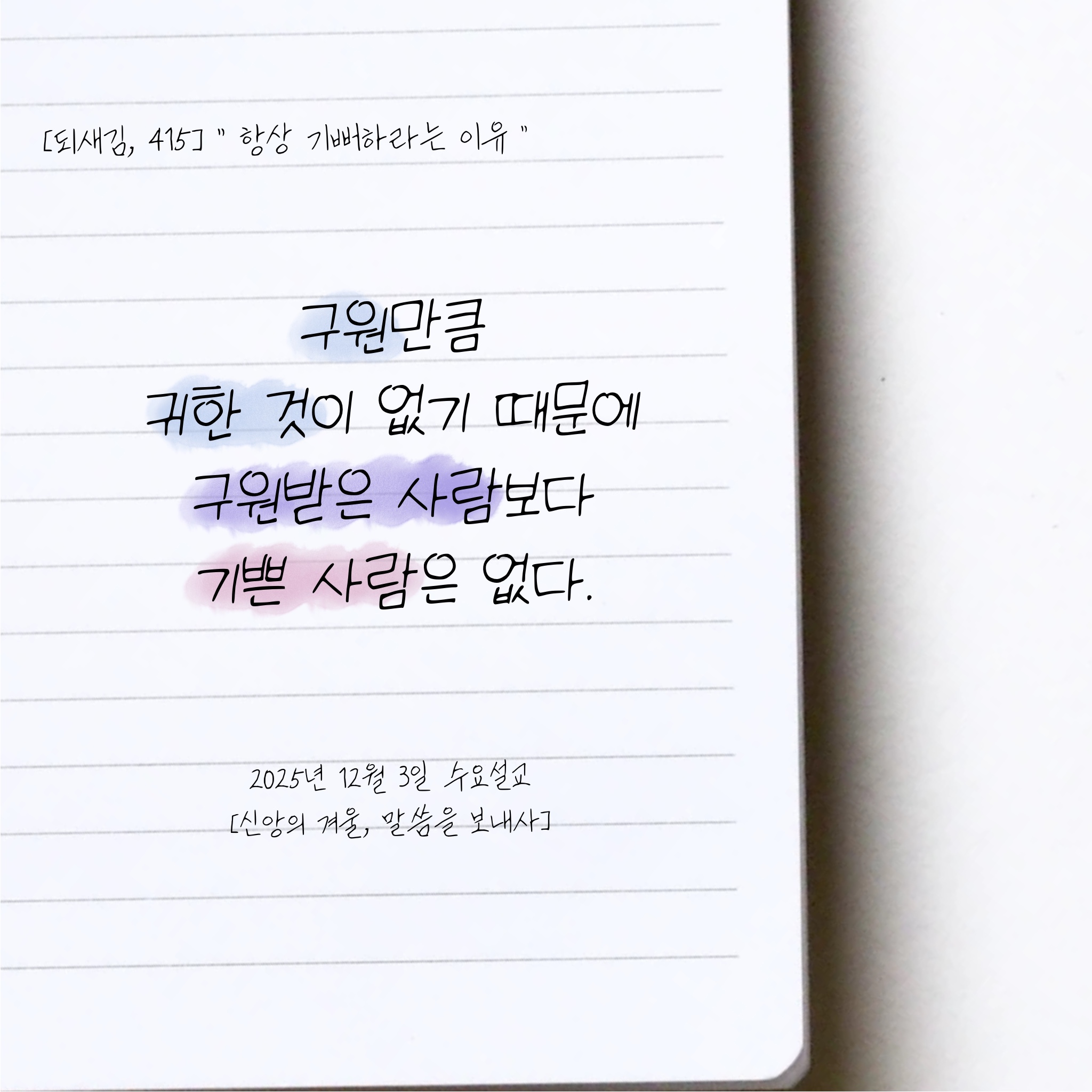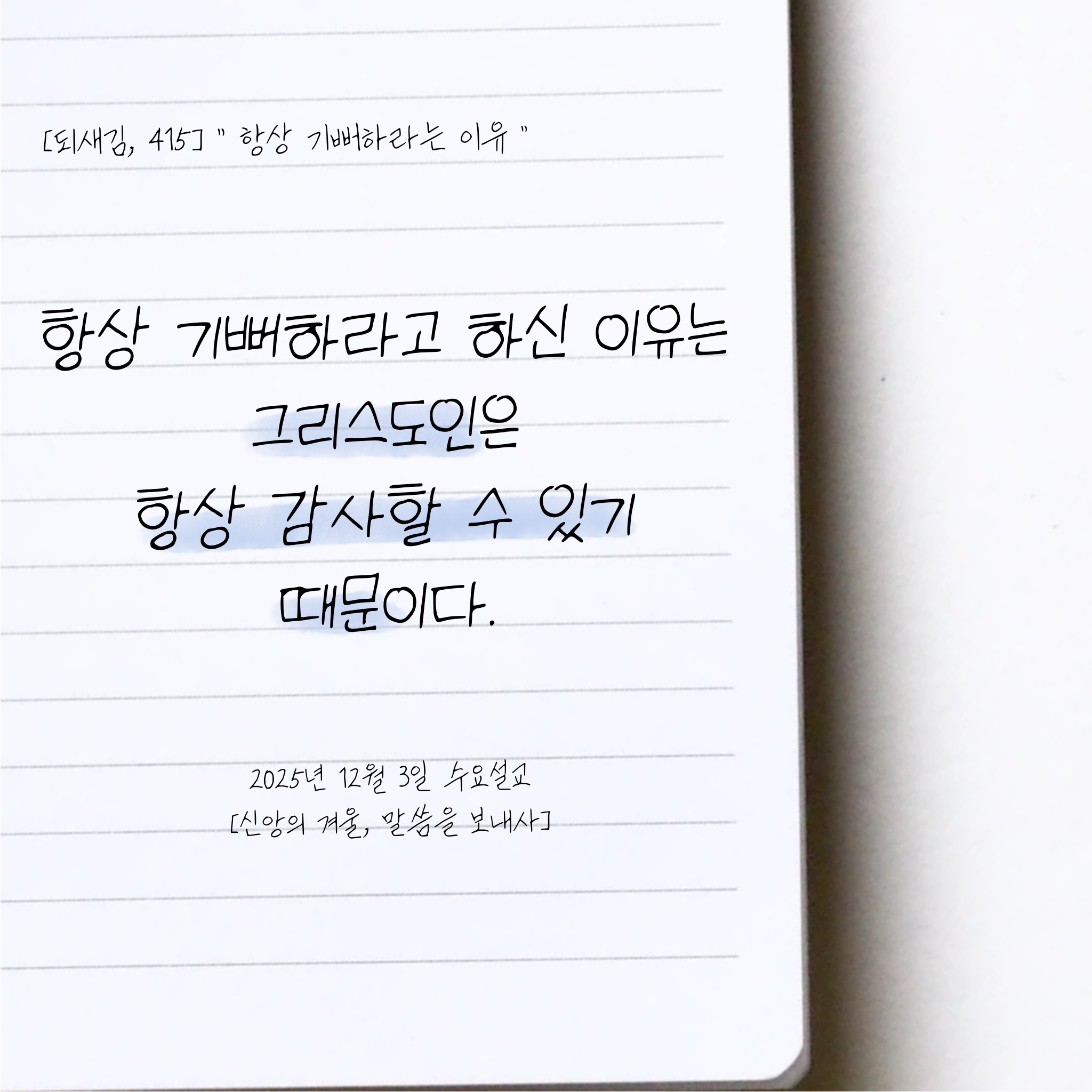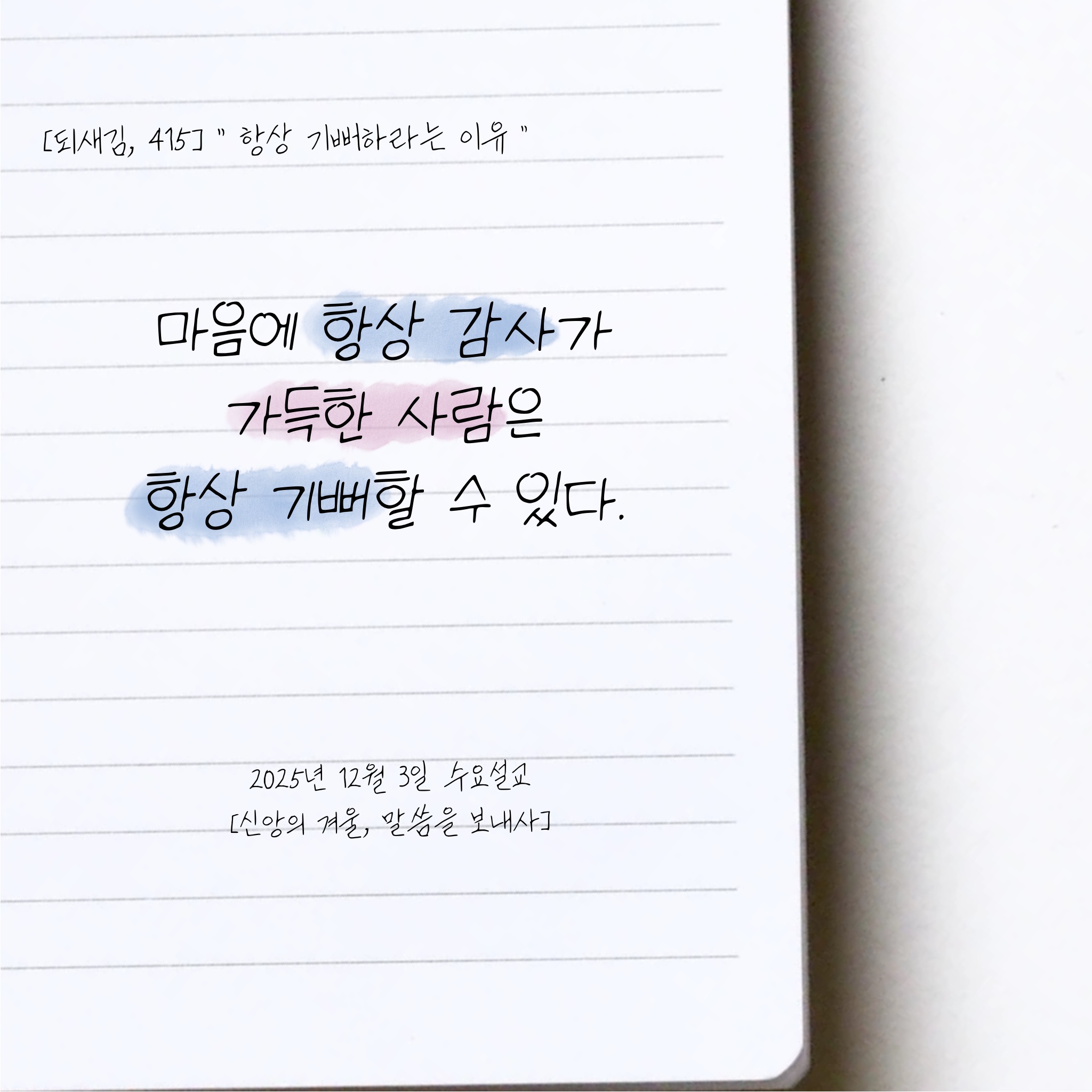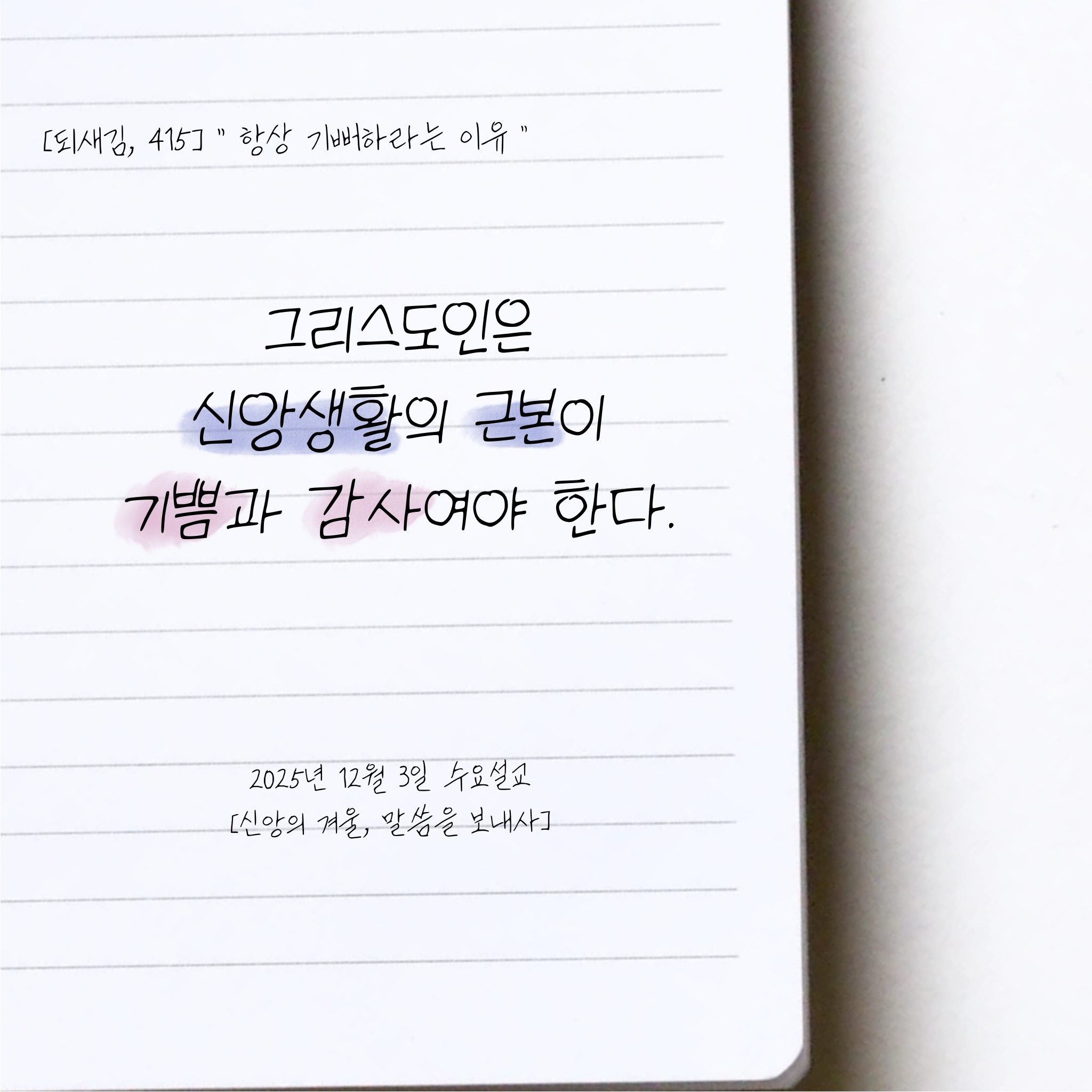 그리고 두 번째 읽었던 말씀처럼 감사라는 게 너무 중요해요. 어려움을 만났을 때 특히 감사는 더욱 중요합니다. 어떤 사람은 어려움 속에서 원망, 불평만 가득하죠. 하나님의 말씀을 받을 마음이 안되는 겁니다. 어떤 형제자매님들이 나에게 위로하려고 다가와도 위로가 안 되는 겁니다. 왜요? 원망, 불평만 가득한데요. 반대로 감사가 가득한 사람은 보십시오. 하나님의 말씀을 대할 때, 다 나에게 하시는 말씀인 거예요. ‘아멘’하면서 듣습니다. 구원받은 그리스도인은 그래서 신앙생활의 근본이 기쁨이어야 됩니다. 감사해야 됩니다.
