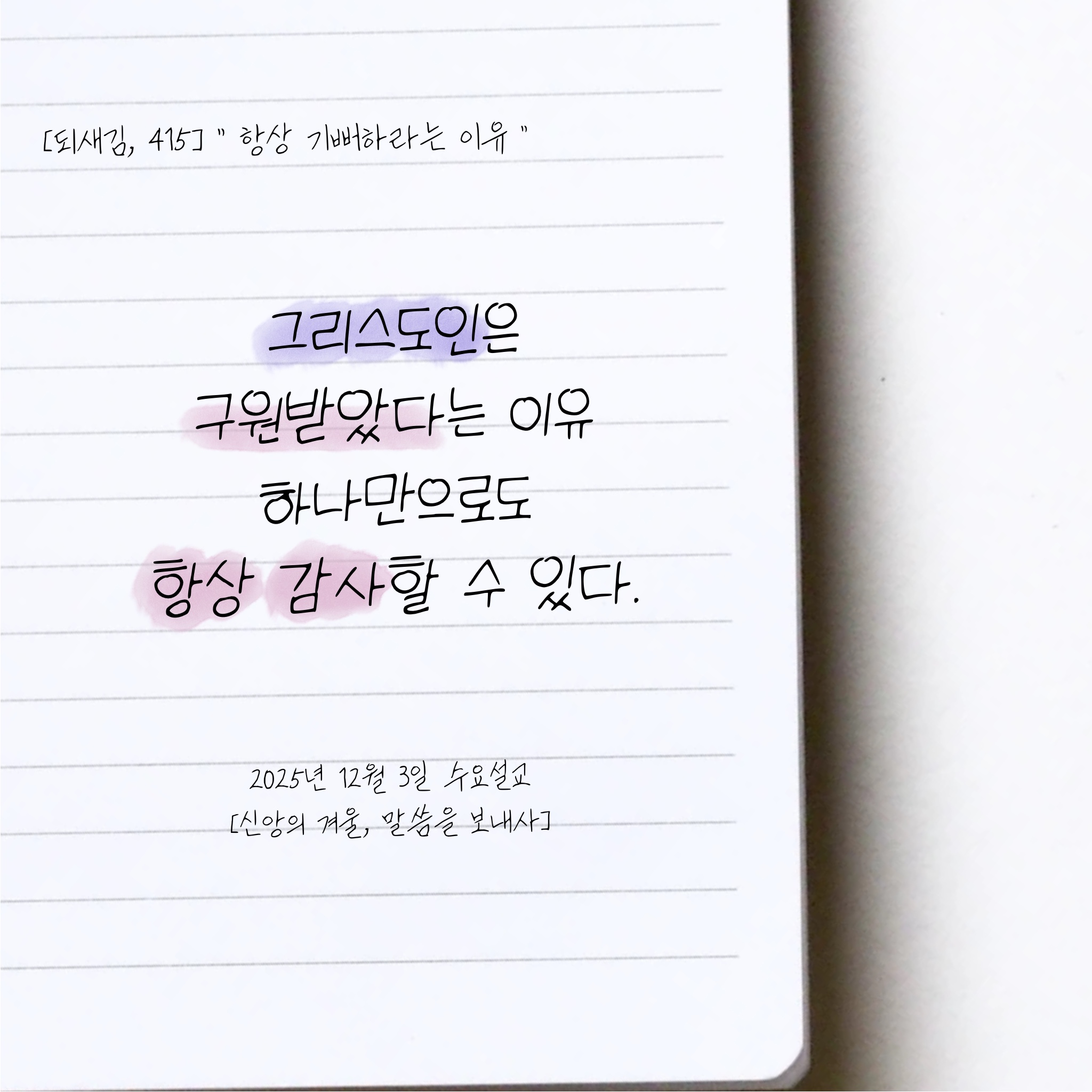 우리 시편 4편 7절과 8절 말씀에 (시 4:7) ‘주께서 내 마음에 두신 기쁨’이라고 그러셨죠. (시 4:7~8) ‘주께서 내 마음에 두신 기쁨은 저희의 곡식과 새 포도주의 풍성할 때보다 더하니이다 내가 평안히 눕고 자기도 하리니 나를 안전히 거하게 하시는 이는 오직 여호와시니이다’ 주께서 내 마음에 두신 기쁨이 뭡니까? 구원에 대한 기쁨이잖습니까. 세상 무엇과도 비교할 수 없는 구원이라는 큰 기쁨이잖습니까. 그렇기 때문에 구원받은 그리스도인은 감사할 수 있습니다.
