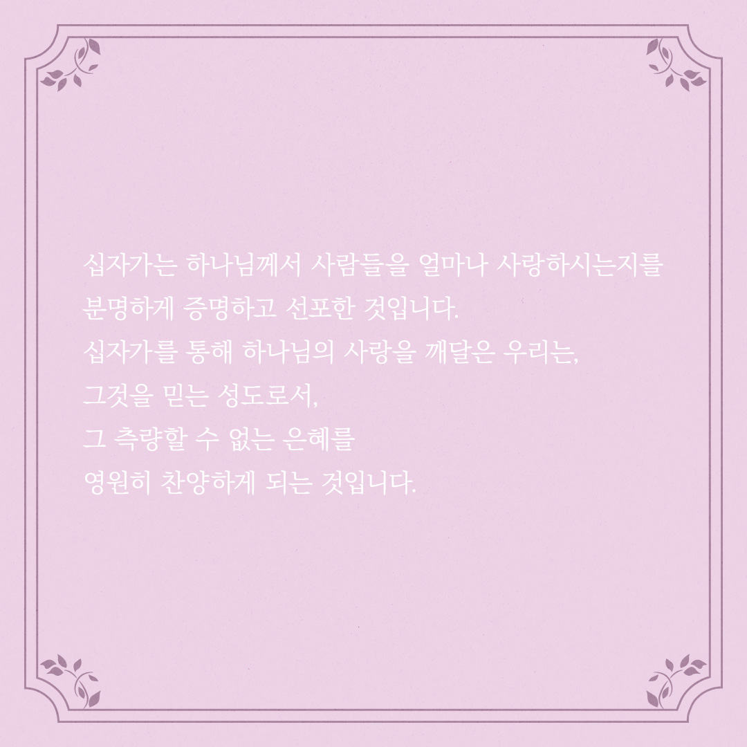 십자가를 통해 하나님의 사랑을 깨달은 우리는, 그것을 믿는 성도로서, 그 측량할 수 없는 은혜를 영원히 찬양하게 되는 것입니다.