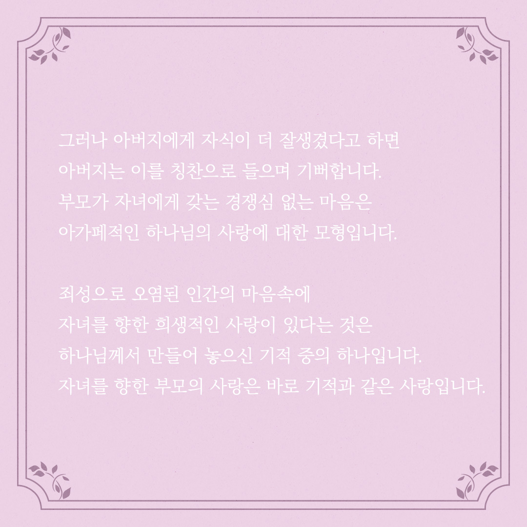 부모가 자녀에게 갖는 경쟁심 없는 마음은 아가페적인 하나님의 사랑에 대한 모형입니다. 죄성으로 오염된 인간의 마음속에 자녀를 향한 희생적인 사랑이 있다는 것은 하나님께서 만들어 놓으신 기적 중의 하나입니다.