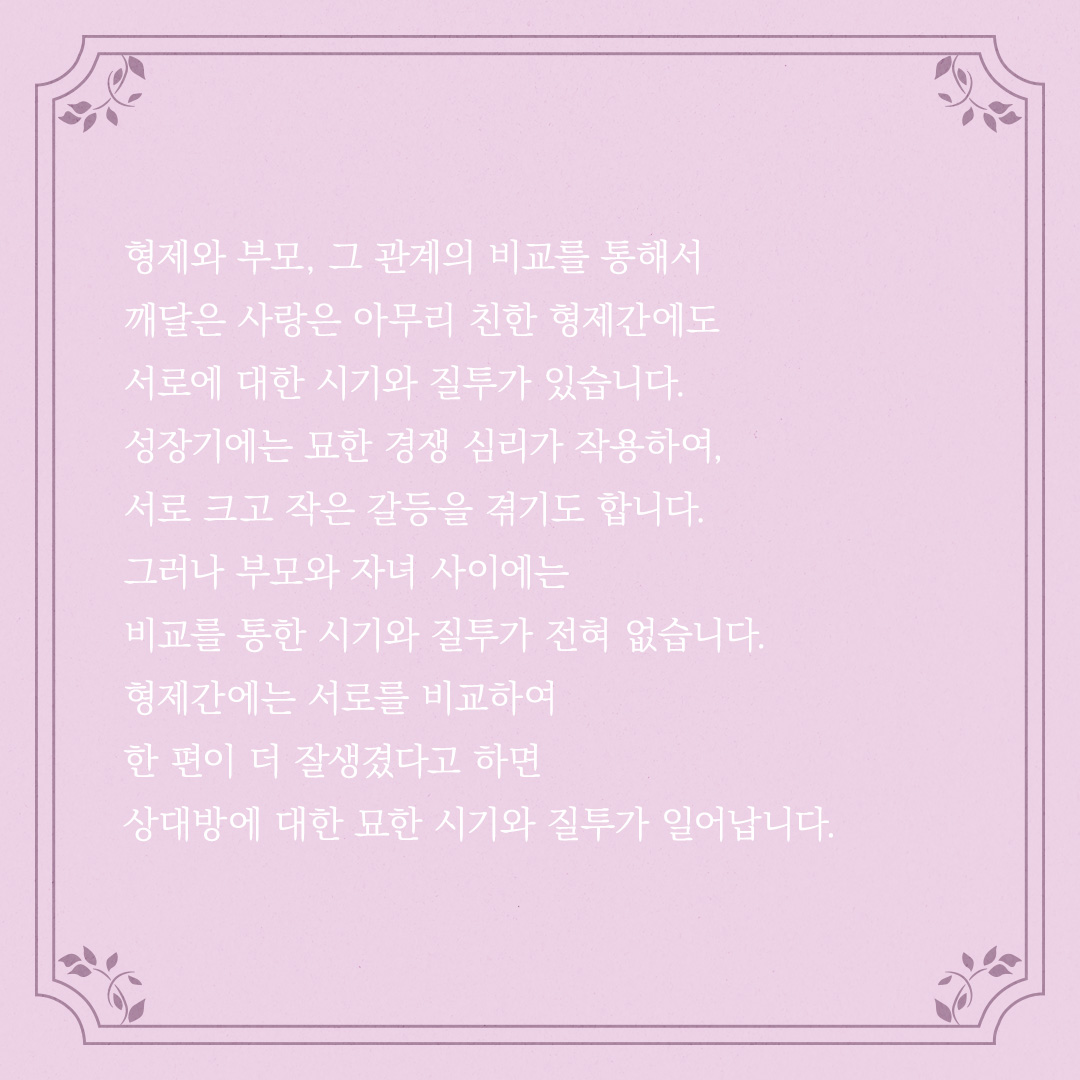 형제와 부모, 그 관계의 비교를 통해서 깨달은 사랑은 아무리 친한 형제간에도 서로에 대한 시기와 질투가 있습니다.