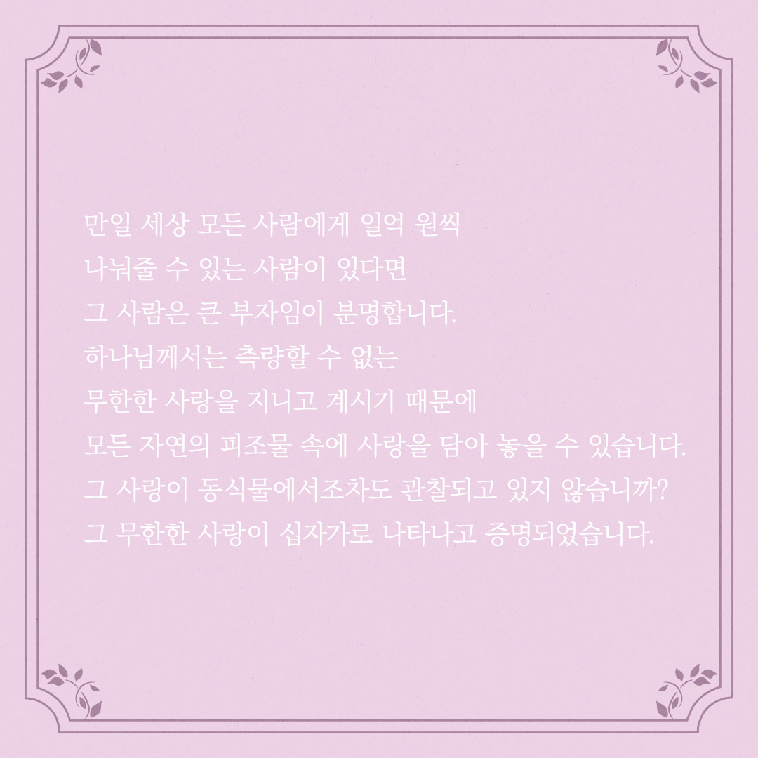 하나님께서는 측량할 수 없는 무한한 사랑을 지니고 계시기 때문에 모든 자연의 피조물 속에 사랑을 담아 놓을 수 있습니다.