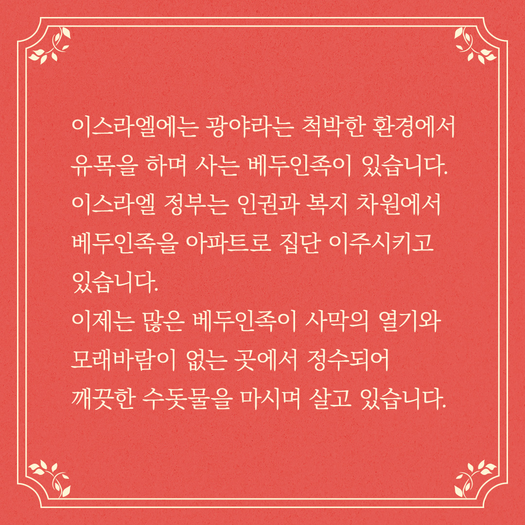 이스라엘에는 광야라는 척박한 환경에서 유목을 하며 사는 베두인족이 있습니다.