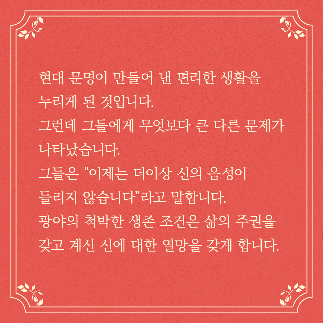 오직 신께 부르짖음으로 삶의 한계를 극복하며 살아왔던 그들은 안락하고 편리한 문명생활을 하면서 더이상 신을 간절하게 부를 필요가 없어진 것입니다.