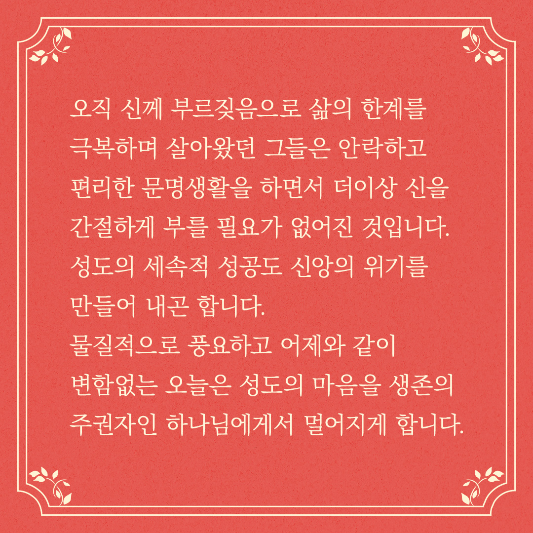 물질적으로 풍요하고 어제와 같이 변함없는 오늘은 성도의 마음을 생존의 주권자인 하나님에게서 멀어지게 합니다.
