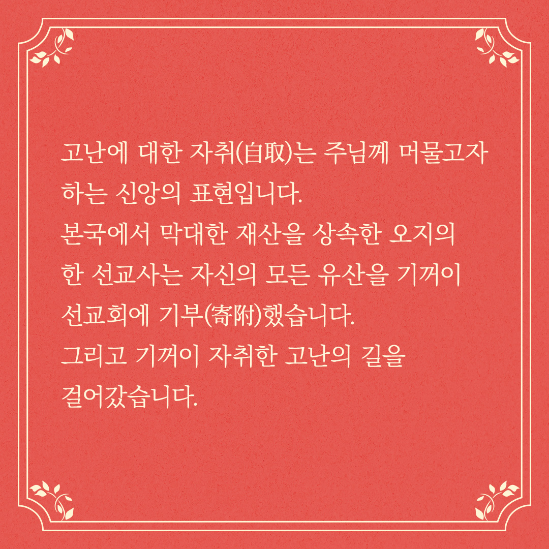 본국에서 막대한 재산을 상속한 오지의 한 선교사는 자신의 모든 유산을 기꺼이 선교회에 기부(寄附)했습니다.