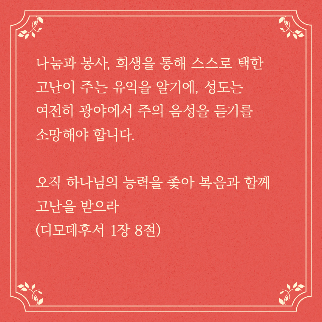 나눔과 봉사, 희생을 통해 스스로 택한 고난이 주는 유익을 알기에, 성도는 여전히 광야에서 주의 음성을 듣기를 소망해야 합니다.