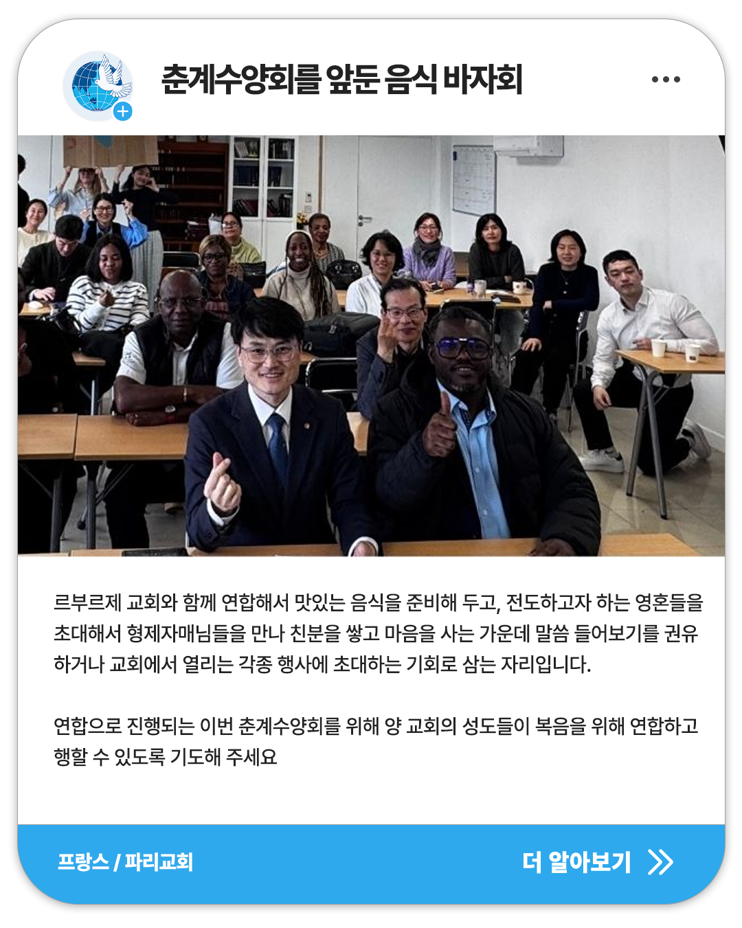 르부르제 교회에 함께 연합해서 맛있는 음식을 준비해 두고, 전도하고자 하는 영혼들을 초대해서 형제자매님들을 만나 친분을 쌓고 마음을 사는 가운데 말씀 들어보기를 권유하거나 교회에서 열리는 각종 행사에 초대하는 기회로 삼는 자리입니다.