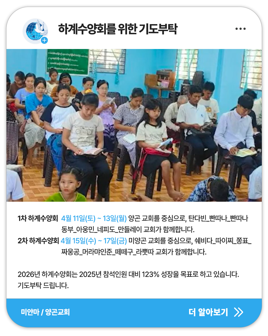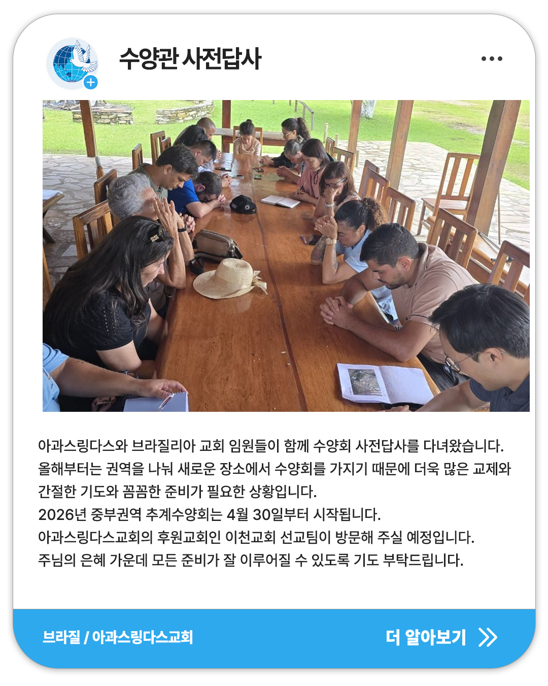 2026년 중부권역 추계수양회는 4월 30일부터 시작됩니다. 아과스링다스교회의 후원교회인 이천교회 선교팀이 방문해 주실 예정입니다. 주님의 은혜 가운데 모든 준비가 잘 이루어질 수 있도록 기도 부탁드립니다.